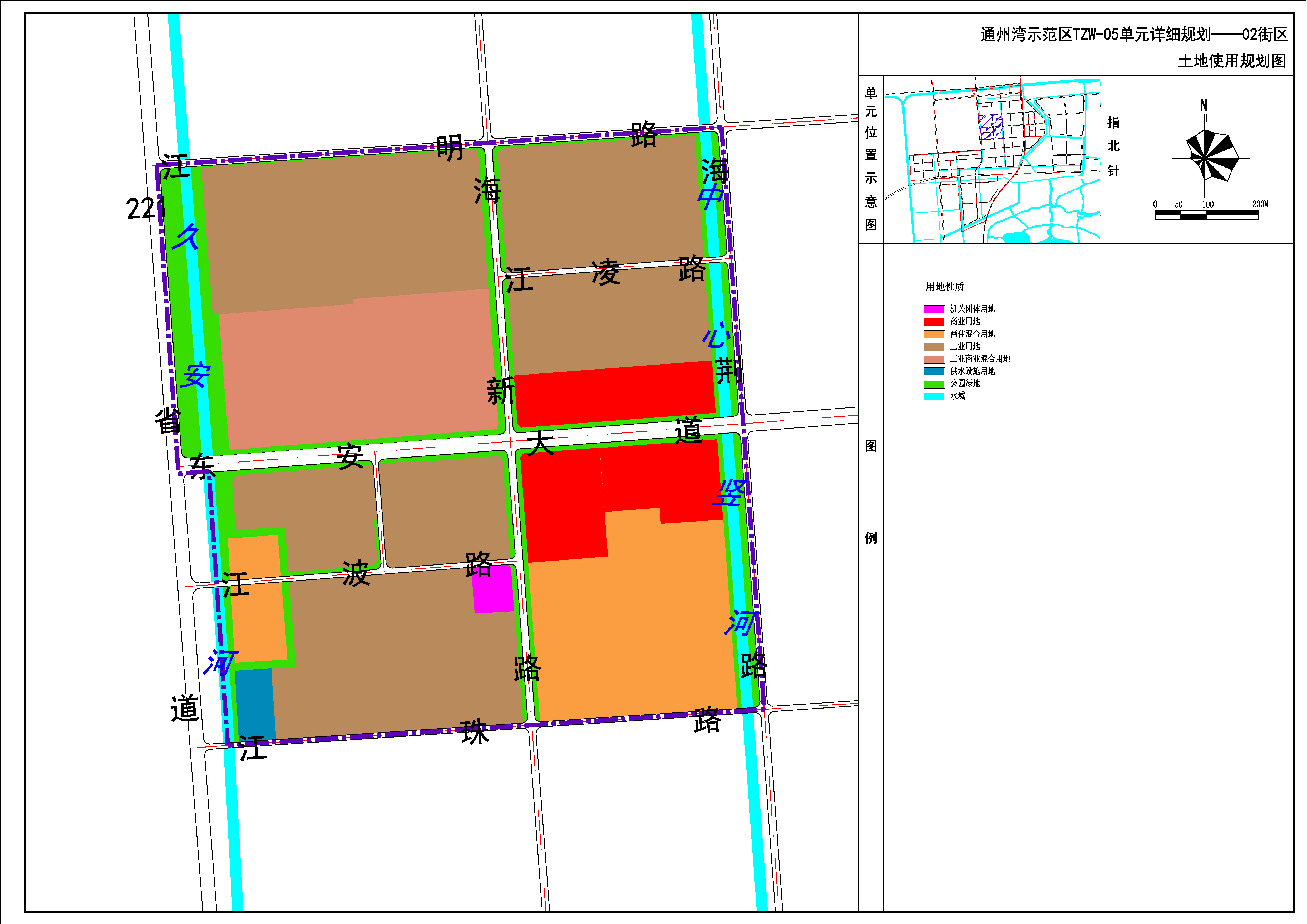 通州湾示范区TZW-05单元02街区东至海荆路、南至江珠路、西至221省道、北至江明路,面积约120.04公顷,规划以二类工业、商业、商住混合用地功能为主。