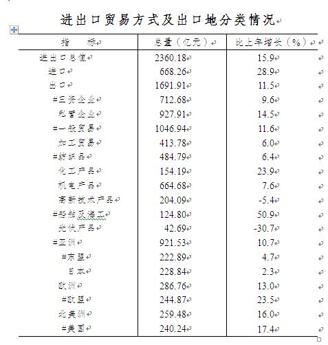 全年进出口总值2360.2亿元,增长15.9%,其中,出口总值1691.9亿元,增长11.5%;进口总值668.3亿元,增长28.9%。年末与我市建立进出口贸易关系的国家和地区220个,比上年增加8个。全市有进出口业绩的企业6606家,增长13.9%。