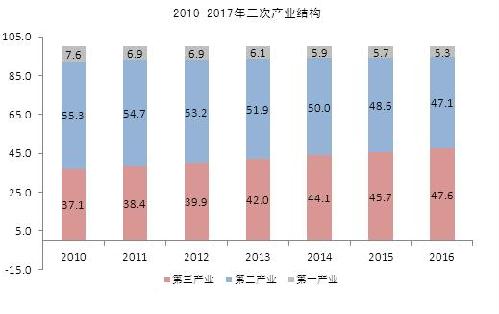 产业结构继续优化。全市三次产业结构演进为4.9:47.1:48.0。“两新”产业较快发展,完成高新技术产业⑤产值7564.3亿元,增长14.9%,占规模以上工业比重达到50.3%,同比提高2.8个百分点;六大新兴产业⑥完成产值5083.6亿元,增长11.7%,占规模以上工业的比重达到33.8%,同比下降0.1个百分点。产业项目加快投入,省级重大项目、市级“双百工程”项目分别完成投资230亿元、830亿元;投资结构加快调整,服务业投资占固定资产投资比重达到51.6%,同比提高1.8个百分点。