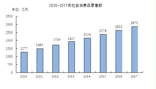 全年社会消费品零售总额2873.4亿元,增长9.1%。其中,城市消费品零售额2122.3亿元,增长9.3%;农村消费品零售额751.1亿元,增长8.7%。分行业看,批发和零售业消费品零售额2625.6亿元,增长9.6%;住宿和餐饮业消费品零售额247.8亿元,增长9.6%。