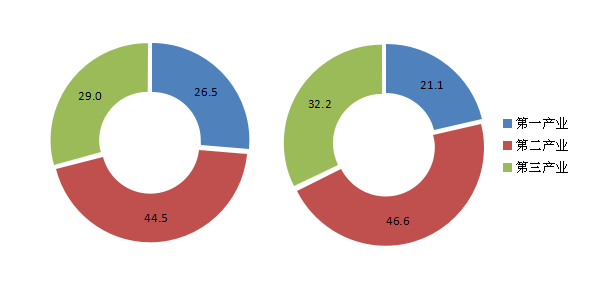 产业结构继续优化。全市三次产业结构演进为5.8:48.4:45.8。全年实现服务业增加值2816.0亿元,增长10.5%,占GDP比重达到45.8%。“两新”产业较快发展,完成高新技术产业④产值6202.5亿元,增长14.6%,占规模以上工业比重达到45.0%,同比提高1.4个百分点。六大新兴产业⑤完成产值4552.4亿元,增长10.6%,占规模以上工业的比重达到33.1%,与上年持平。