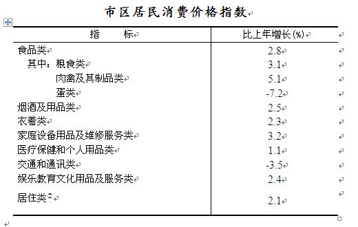 市区居民消费价格总指数101.8,物价总水平比上年增长1.8%,其中,服务项目价格上涨2.6%,消费品价格上涨1.4%。八大类消费价格呈现“七涨一降”的态势。