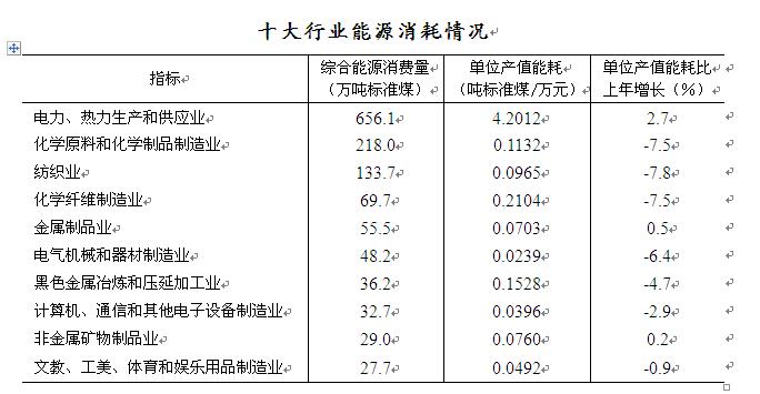 规模以上工业企业中,七大高耗能行业产值增长4.8%,占规模以上工业产值比重为30.3%,同比下降1.2个百分点。初步核算,全市能源消费总量2660.17万吨标准煤,万元地区生产总值能耗⑨为0.452吨标准煤,比上年下降5.31%。