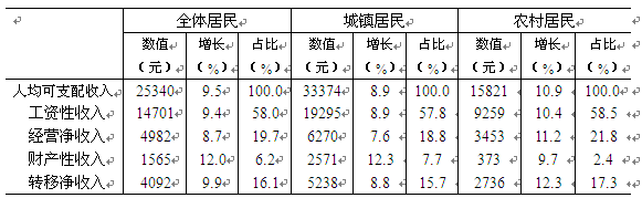 城乡居民收入继续增加。全体居民人均可支配收入⑥25340元,比上年增长9.5%,按常住地分,城镇居民人均可支配收入33374元,比上年增长8.9%;农村居民人均可支配收入15821元,比上年增长10.9%。