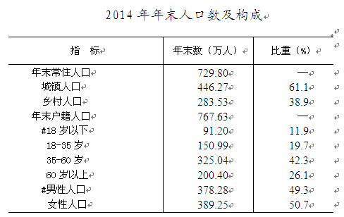年末全市常住人口729.8万人,其中,城镇人口达到446.3万人,增长2.1%,城镇化率61.1%,比上年提高1.2个百分点。年末户籍人口767.6万人,比上年增加1.1万人。全市人口出生率7.54‰,人口死亡率8.1‰,人口自然增长率-0.56‰。