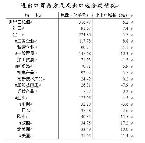 全年进出口总值316.5亿美元,增长6.2%,其中,出口总值224.8亿美元,增长5.7%;进口总值91.7亿美元,增长7.4%。年末与我市建立进出口贸易关系的国家和地区199个,比上年增加3个。全市有进出口业绩的企业5094家,增加9.8%。